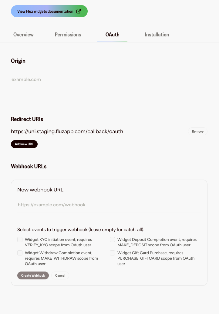 - Navigate to For Developers → OAuth → Webhooks